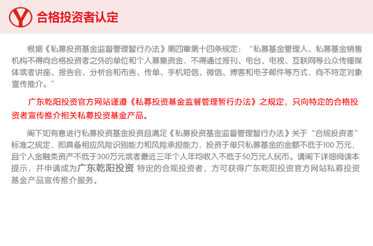 廣東乾陽投資管理有限公司于2011年5月在廣州成立,注冊資本1000萬元,是一家在中國證券投資基金業(yè)協(xié)會登記備案的私募投資基金。 公司秉持“客戶利益,審慎經(jīng)營,規(guī)范誠信,志在久遠(yuǎn)”的經(jīng)營理念,踐行“公司的內(nèi)在價值決定其投資價值”的核心投資理念,悉心打造公司的核心競爭力——深入嚴(yán)謹(jǐn)?shù)耐堆蟹治瞿芰Γ∈亻L期、集中的投資策略并結(jié)合基于估值及市場趨勢的選時策略,形成了乾陽投資成熟穩(wěn)健的投資風(fēng)格。 公司以產(chǎn)業(yè)資本的視角深度挖掘資本市場中的優(yōu)秀企業(yè),通過建立嚴(yán)謹(jǐn)?shù)纳鲜泄菊{(diào)研制度,嚴(yán)肅的投資決策流程和嚴(yán)格的風(fēng)險管控制度,力圖實現(xiàn)高回報與確定性的完美統(tǒng)一,幫助客戶分享企業(yè)持續(xù)穩(wěn)健成長帶來的... |